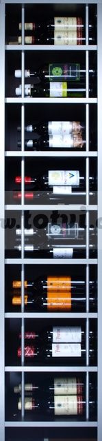Estantería modular modelo MALVASIA, con 8 huecos para 8 botellas cada uno. Fabricado en tablero con melamina color negra tipo soft, cantos de pvc color nero y barras de aluminio lacado para frenar la caída de las botellas, es modular por lo que se unen entre sí, pudiendo combinar también con los modelos CUBOS, MERLOT y MERLOT SUPER.